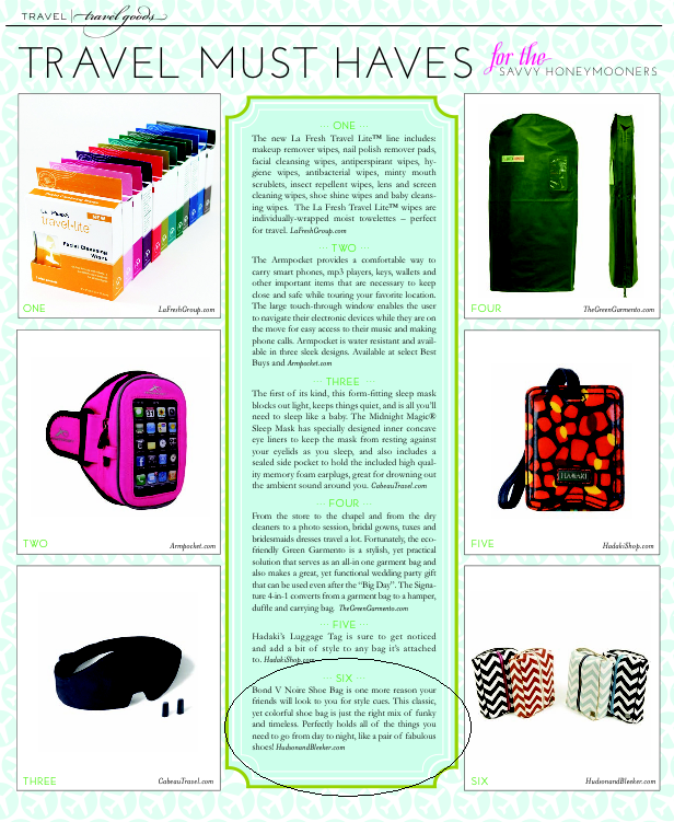 Hudson+Bleecker Bond V shoe bags are featured in the “Travel Goods” coverage in the latest issue of Southern Bride Magazine.