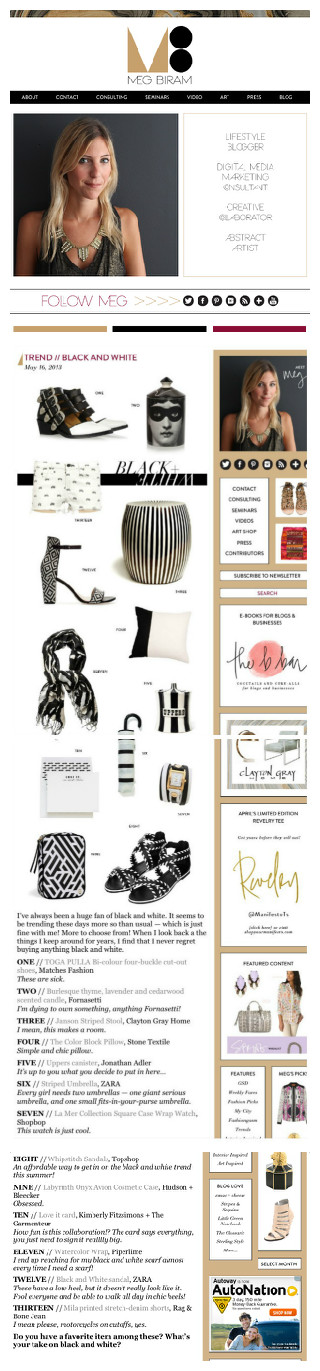 Lifestyle blogger, Meg Biram, included Hudson+Bleecker’s Labyrinth Onyx Avion Cosmetic Case within her “Trend Black and White” coverage.