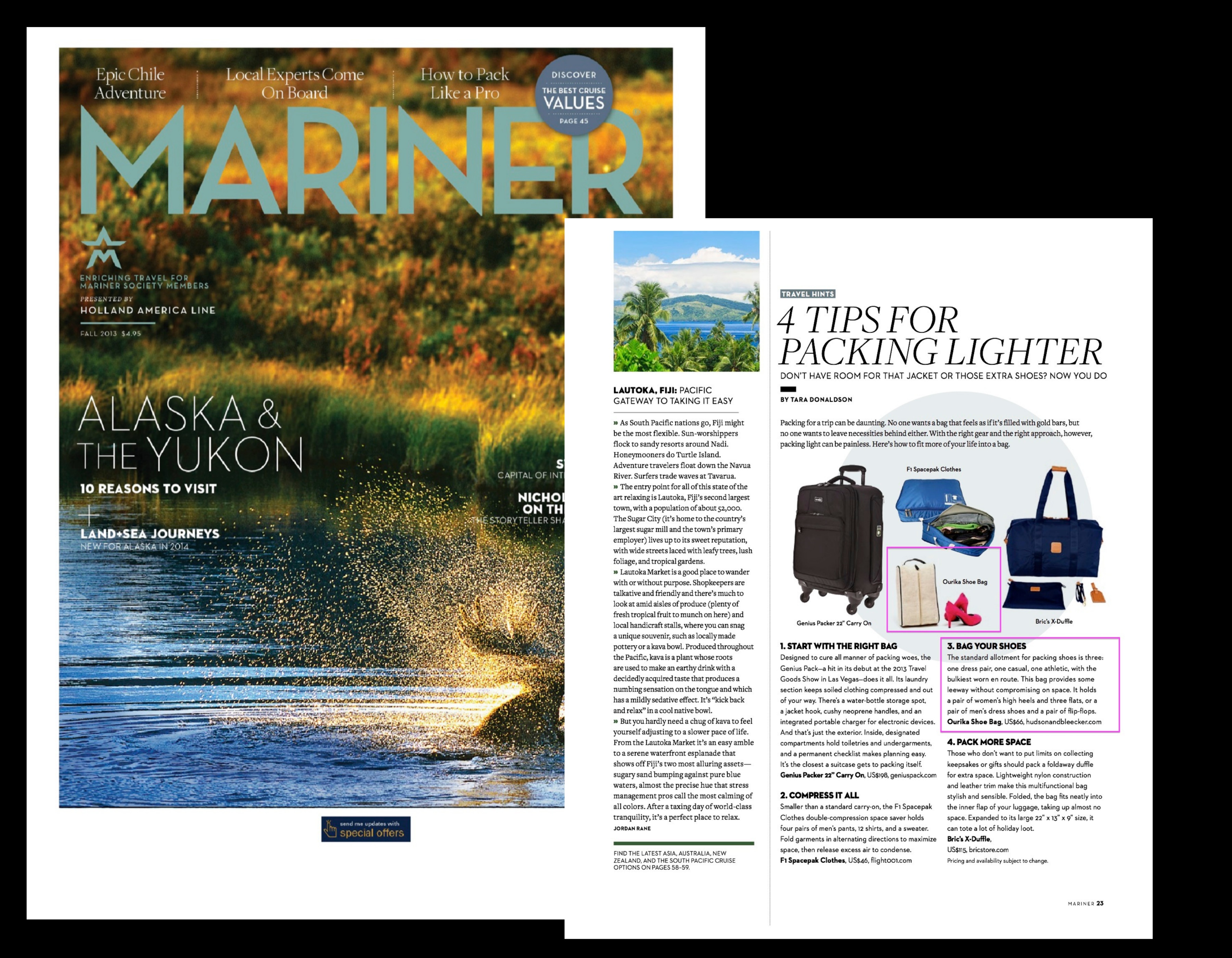 The Fall 2013 issue of Mariner Magazine includes Hudson+Bleecker’s Ourika shoe bag within the publication’s “4 Tips For Packing Lighter”.