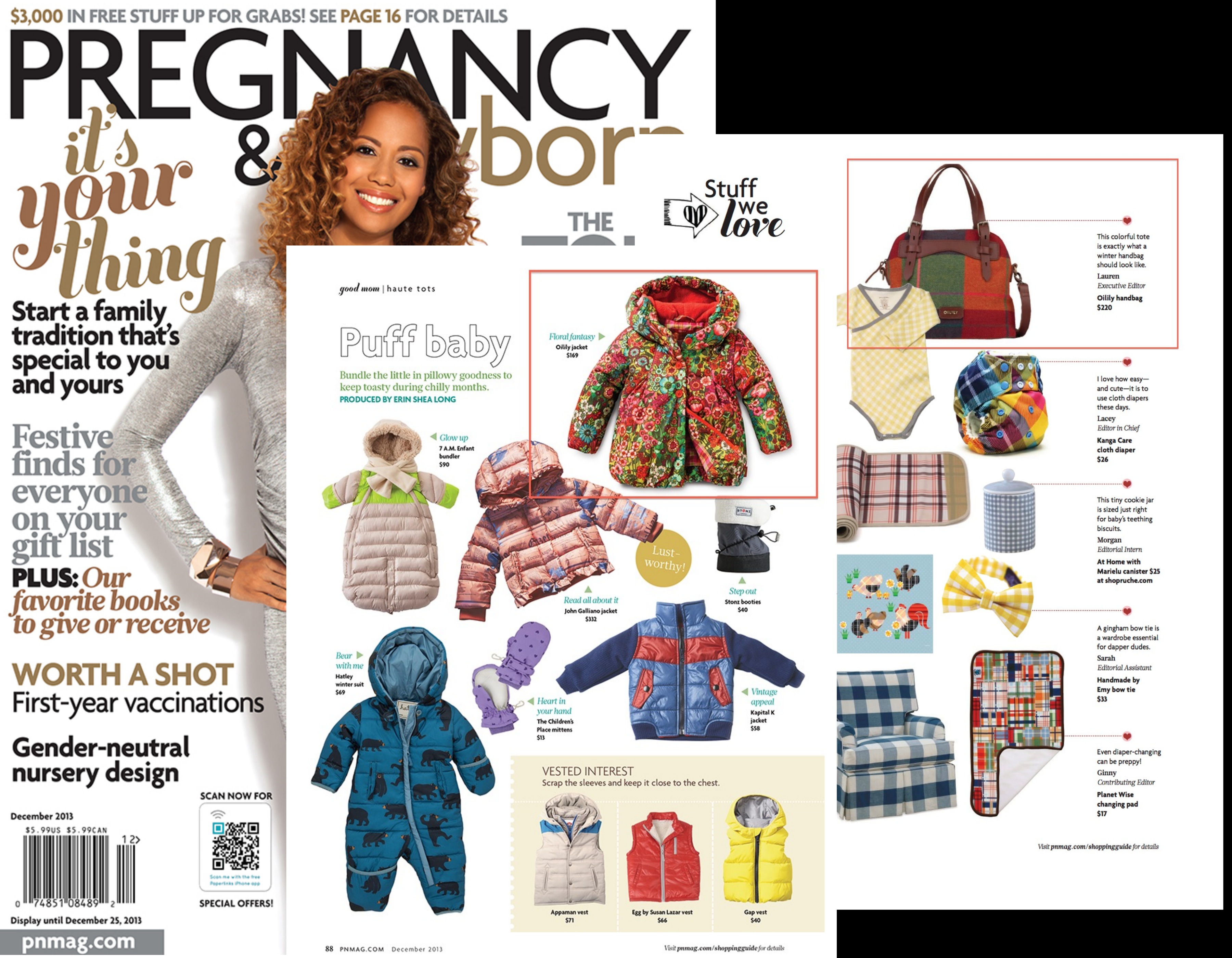 Pregnancy & Newborn Magazine features Oilily’s Woolen Check Handbag in Burgundy within the publication’s “Stuff We Love” in addition to the Chilly Coat Sea of Flowers within the “Puff Baby” coverage in the December 2013 issue.