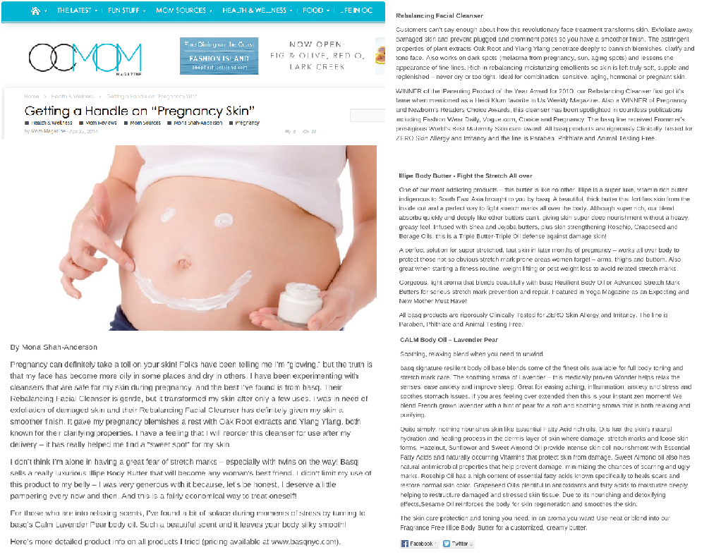 OC Mom Magazine, the premiere lifestyle magazine for the Orange County Mom, is a place where parents can connect and learn about the latest in beauty, fashion and lifestyle. The Magazine recently featured a review on a selection of basq skincare items including the Rebalancing Facial Cleanser, Illipe Body Butter and CALM Resilient Body Oil.
