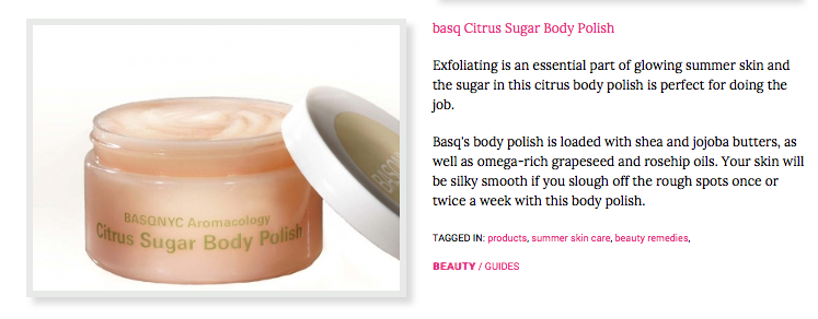 Lady Lux, the digital, luxury lifestyle magazine that covers the latest in luxury fashion, technology, eco-green and luxury lifestyle trends online, includes basq skincare’s Citrus Sugar Body Polish within “Get Gorgeous With These Skincare Products” coverage.