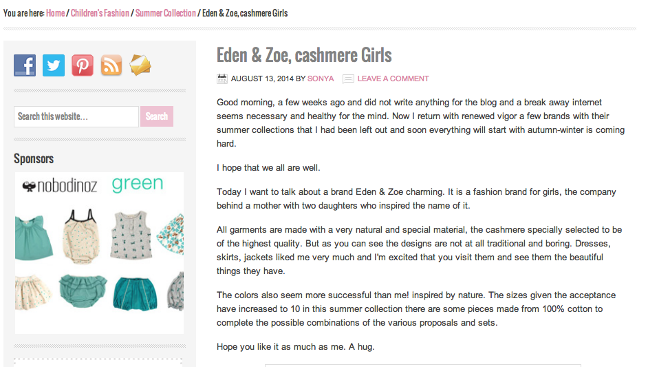 Based in Spain, MiniModa.es is a blog dedicated to children’s fashion, maternity fashion, accessories and childcare. Recently they spotlighted the summer collection from eden & zoe.