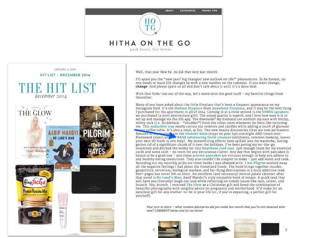 Travel and Lifestyle site, Hitha on the Go, includes basq’s Rebalancing Facial Cleanser in “The Hit List” coverage.