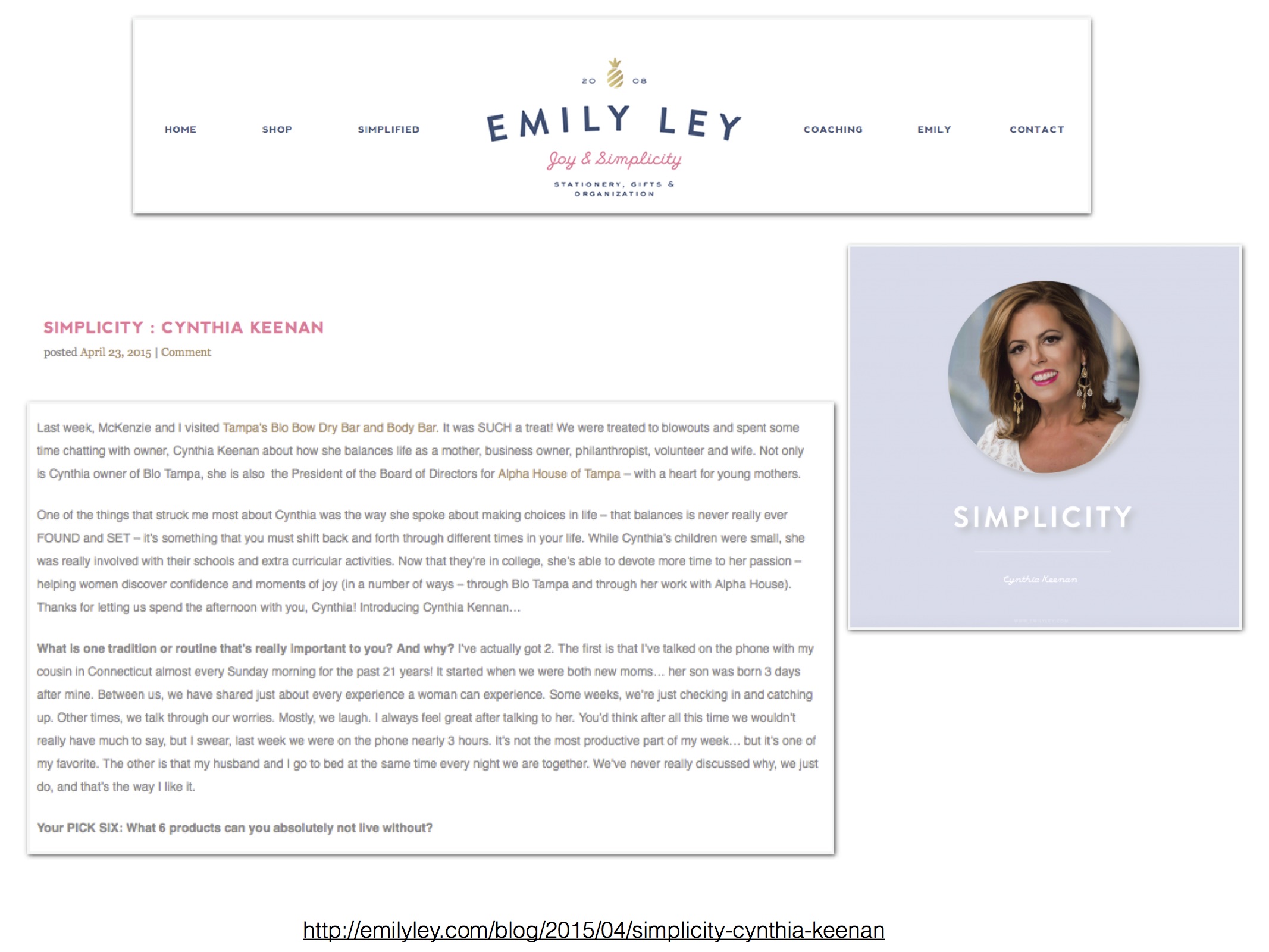 Emily Ley’s mission is to inspire busy women: mamas, wives, pig-tail brushers, tailgate hostesses, PB&J makers to choose simplicity and joy every day. The site recently spotlighted Cynthia Keenan, of Blo Blow Dry Tampa, in their latest “Simplified” series.