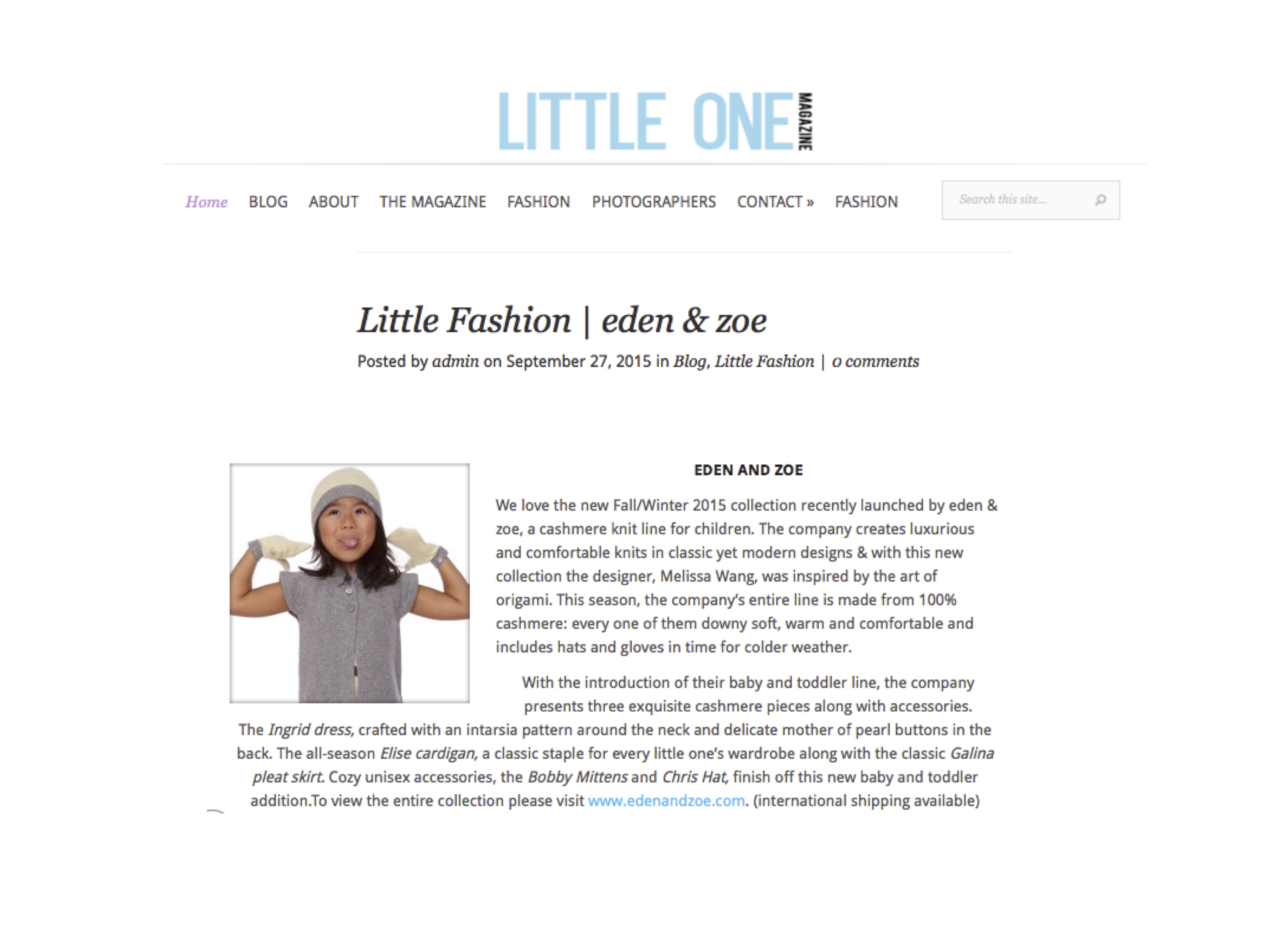Little One Magazine features an item on eden & zoe’s new FW collection. Little One explores the current trends, up-and-coming children’s clothing brands, introduces fashion driven photographers, talented children and style-loving mothers from every corner of the world. Click for full article.